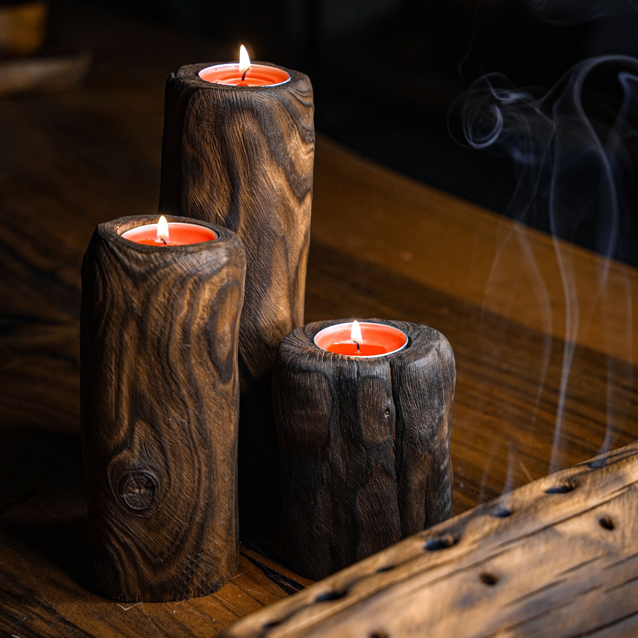 پک سه تایی جاشمعی های روستیک چوب کاج در سه ارتفاع ۱۰ و ۱۵ و ۲۰ سانتی متری می‌باشند. وزن این ۳ قطعه تقریبا ۸۵۰ گرم است. برای زیبایی بیشتر تمام سطح جاشمعی ۳ تکه سوخته کاری شده است.